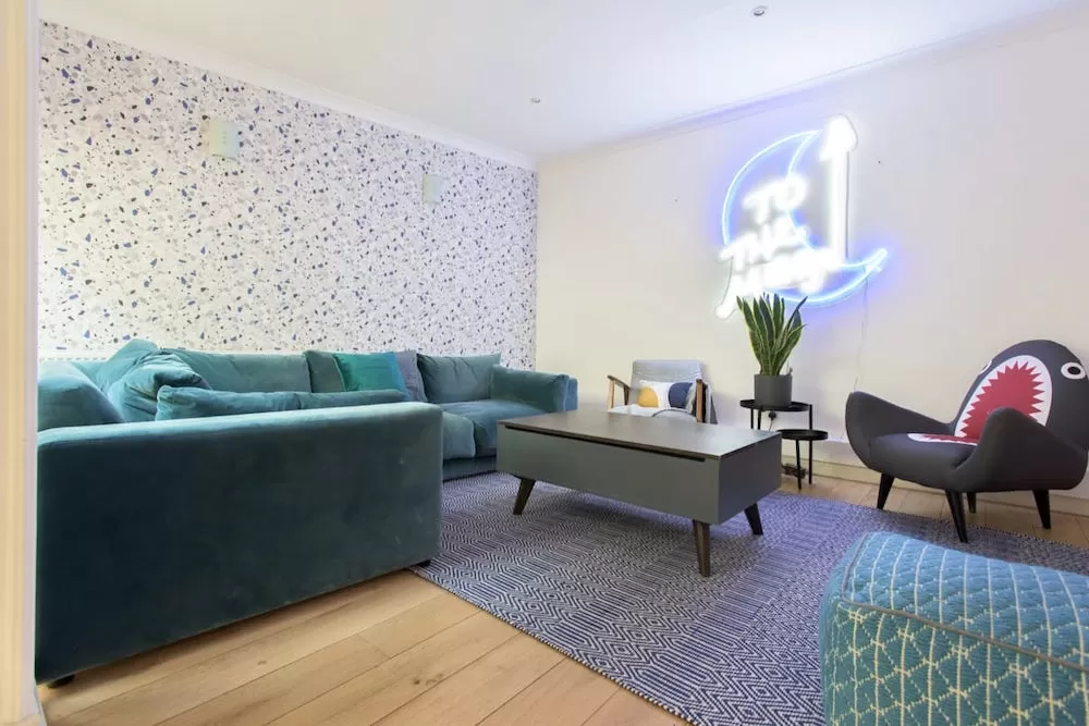 neighborhoods in London. It's a lovely district with cool shops, charming cafes, lively pubs, and more. It makes sense to want to live here, right? And if you do, you'll want to rent out this chic Powis Square Escape. It's a modern two-bedroom flat with lots of space, artistic furniture, ample storage, and more.