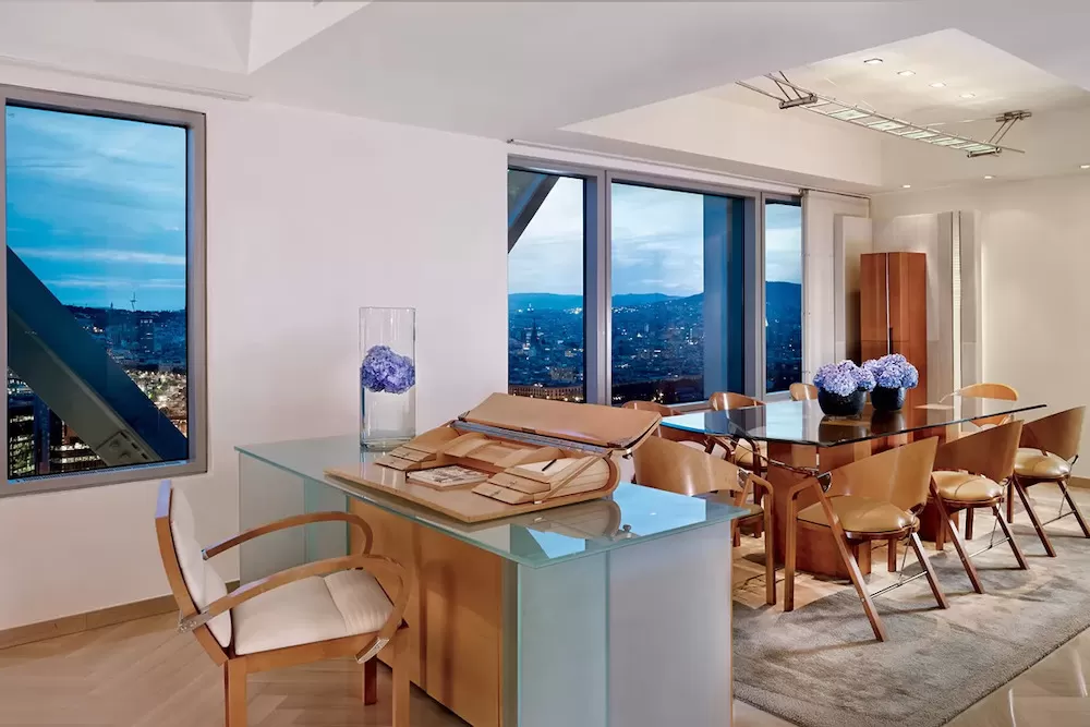 What could you expect in a luxurious penthouse atop a five-star hotel? For one thing, one of the best work-from-home areas ever! The glass-encased desk in this one-bedroom Arts Barcelona penthouse is amazing! It's the perfect spot to work from home in so many ways. Firstly, the best is big and comes with many accessories that can help you work with little to no hassle. Secondly, just look at that view! The building's seaside location allows for this rental's tenant to have some of the most amazing views in