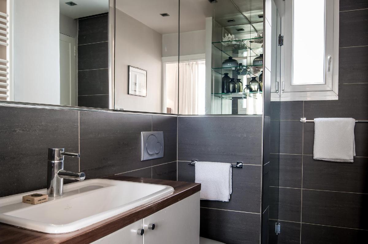 Perfectly situated at the corner of Arc de Triomphe on top of the Champs Elysées is this luxury apartment rental in Paris with 2 beautiful bathrooms. It lies on the 5th floor of a building along rue Lauriston, and it offers 2 bedrooms and a stylish balcony that boasts wonderful views of the Parisian neighbourhood. One bathroom is white and grey and the other is in a stylish brown hue. Truly unique bathrooms where you’ll love relaxing at the end of the day.