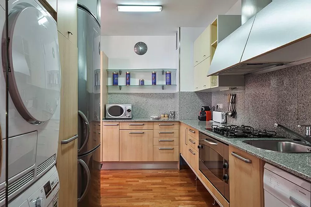 Do you want to cook food in another open kitchen? This gorgeous two-bedroom apartment along Carrer Bonaire has just the space you need. A whole side corner lines with first-class equipment, all with a shimmering stainless steel finish, will make you feel like you're cooking in the future. Try making some churros here, the stove is ready for you to fry them. And once you've tasted your own treats, you'll lessen going to the many churros shops in Barcelona! That's how effective and neat this kitchen is. You can work practically all day long and you still won't get tired. You'll just enjoy doing it!